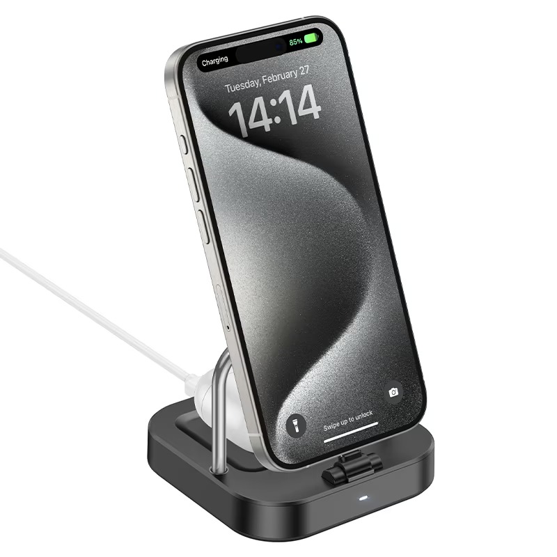 O carregador de mesa 2 em 1 Hoco CQ16B Astute oferece uma solução elegante e prática para carregar simultaneamente seu smartphone e seus fones de ouvido sem fio. Com seu design compacto e recursos de carregamento sem fio eficientes, é o complemento perfeito para sua mesa, criado-mudo ou espaço de trabalho.